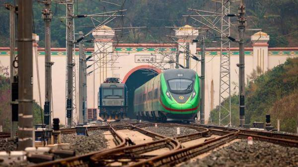中老铁路“复兴号”动车驶过友谊隧道。中国铁路昆明局集团有限公司供图