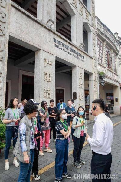 4月10日,导游为“中国有约”采访团讲解骑楼历史文化街区情况。