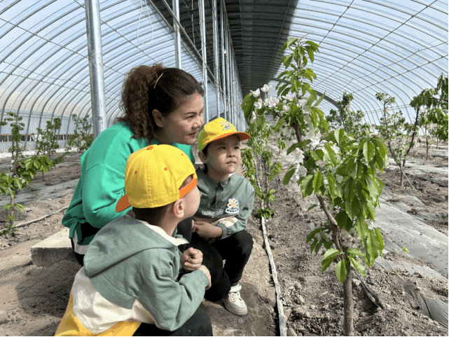 从食用菌产业园步行500米,便来到了团结镇特色林果种植基地,一座座设施农业大棚内,一颗颗刚挂果的油蟠桃“藏”在绿叶下,一簇簇饱满的车厘子果实藏在绿叶之中……孩子们置身其中感受设施农业大棚种植的魅力。