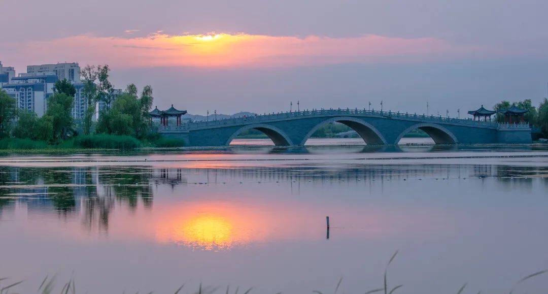 这里还是绝佳拍照取景地,近处的石桥,亭台、楼阁,远处的高楼仿佛静卧在水面上,一座座建筑与河水相融相依,此时的绣江河公园简直就是一幅美丽的山水画卷。