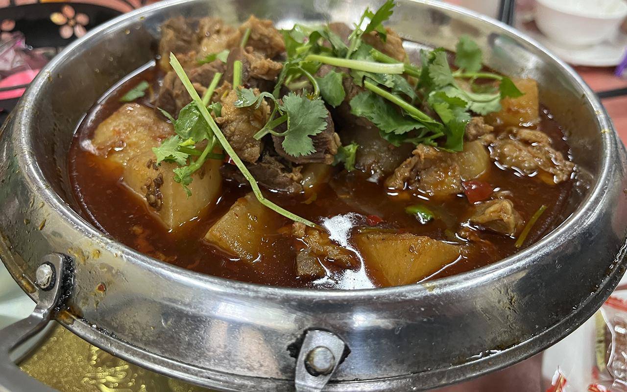 终于是看到一个大菜了,萝卜炖牛腩,这个菜还是可以的,只不过肉比较少,基本上都是白萝卜,这个也是用大锅煮好的,然后每一桌打上一点,口感相对来讲也并不是特别好,看着相对比较的油腻,而且味道也比较咸了。