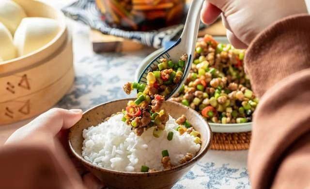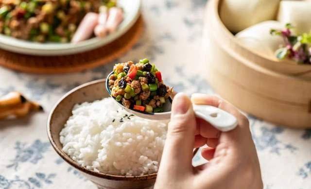 直接上勺子,脆甜的蒜薹丁、干香的肉末、咸香的豆豉,辣椒圈也不放过,全都捞到米饭上!