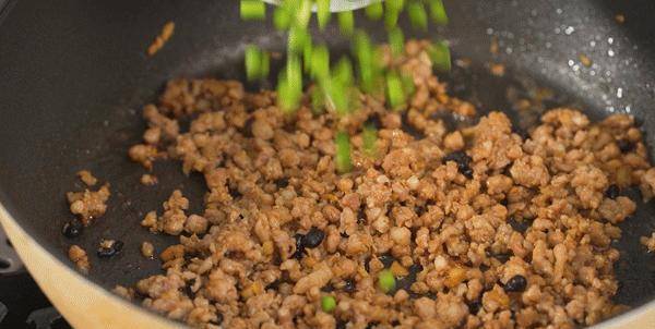 3.起锅热油,放入姜蒜末、豆豉爆香,加入猪肉末炒散
