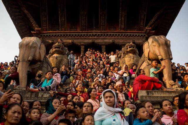 ↑4月10日,人们聚集在尼泊尔中部加德满都谷地的巴克塔普尔观看传统的新年庆典。