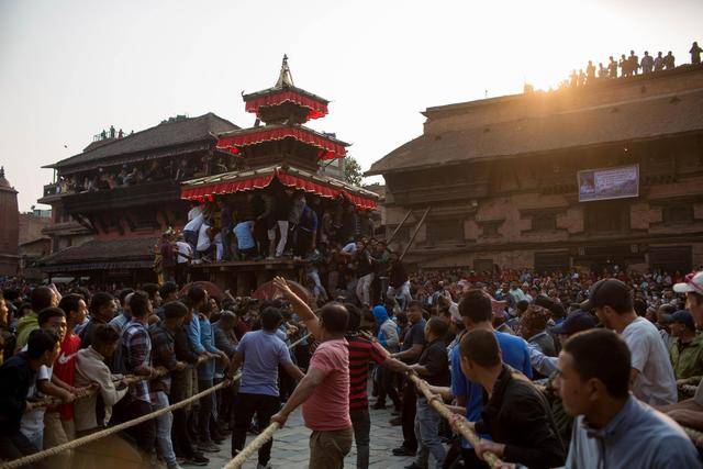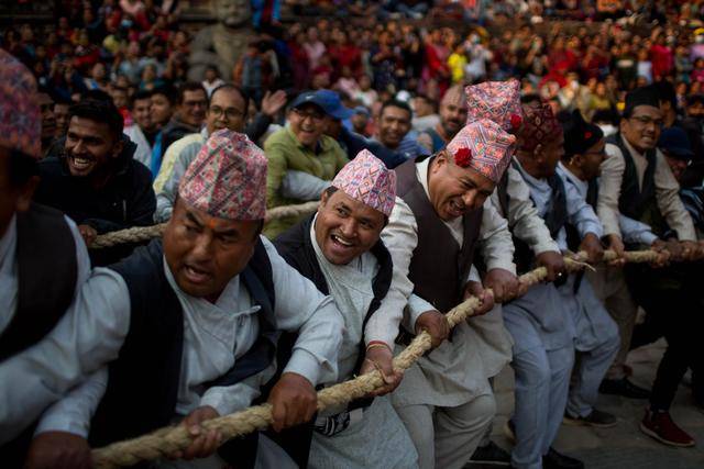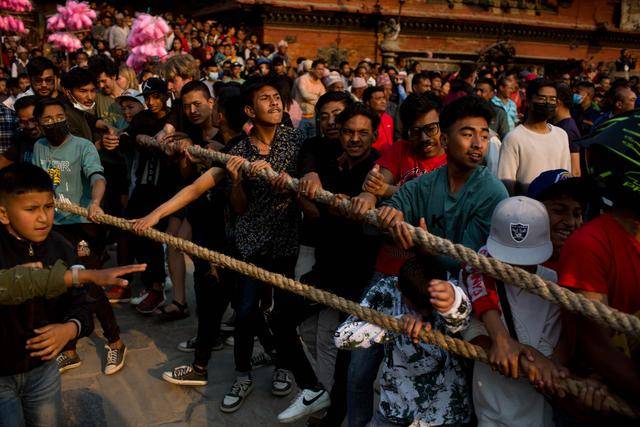 ↑4月10日,在尼泊尔中部加德满都谷地的巴克塔普尔,参加新年庆典的人们在传统的庆祝活动上合力拖拽巨大的神像战车。