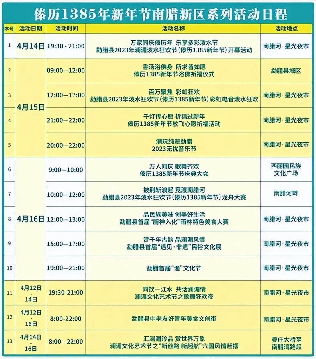 4月14日—16日,勐腊县南腊新区将开展彩虹电音狂欢泼水节、新年节庆典大会等传统活动,以及雨林特色美食大赛、首届“遇见·非遗”民俗文化展、“渔”文化节、中老友好青年美食文创街、风情赶摆等创意活动,带大家跨一场异域风情的傣家年。