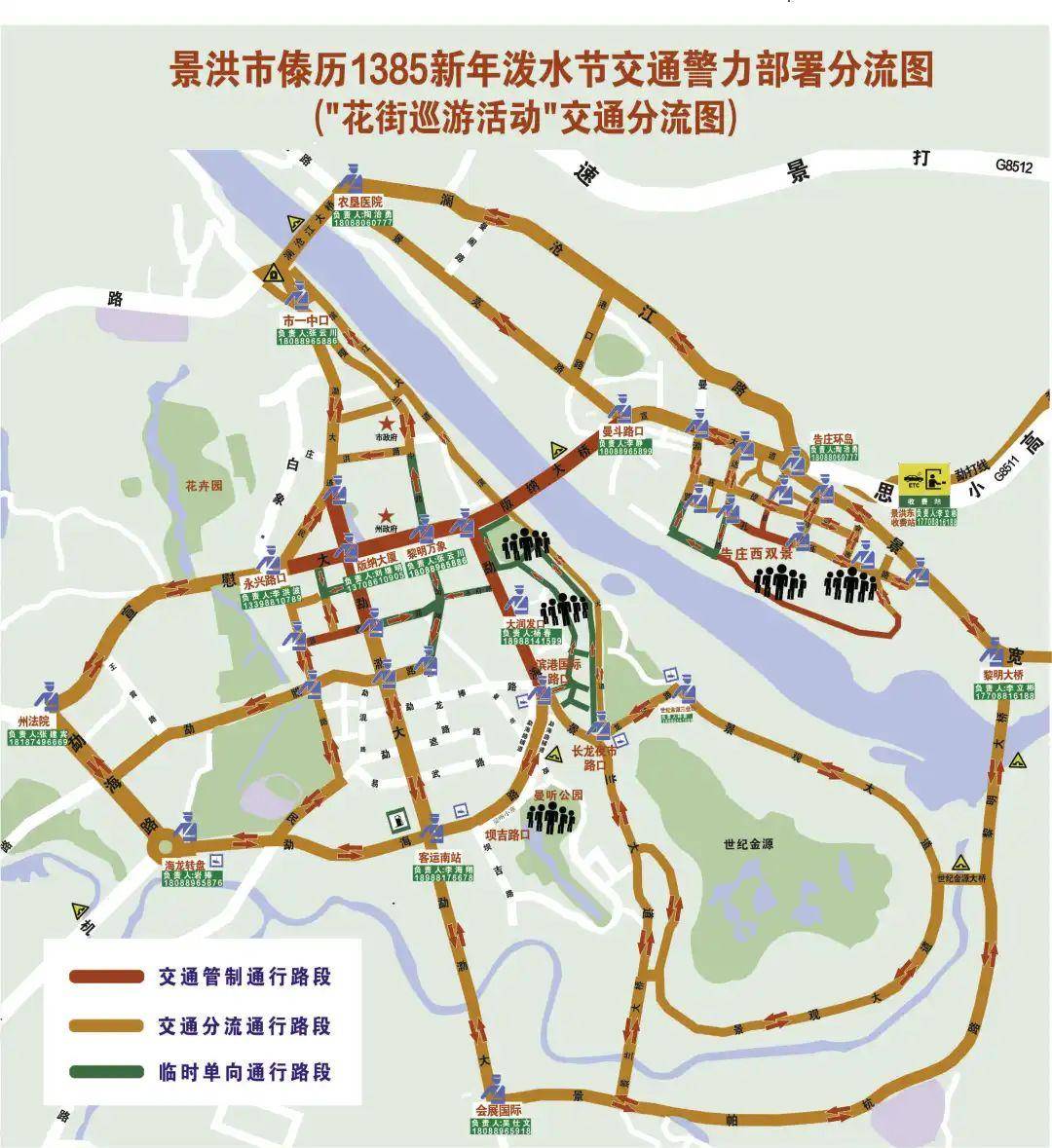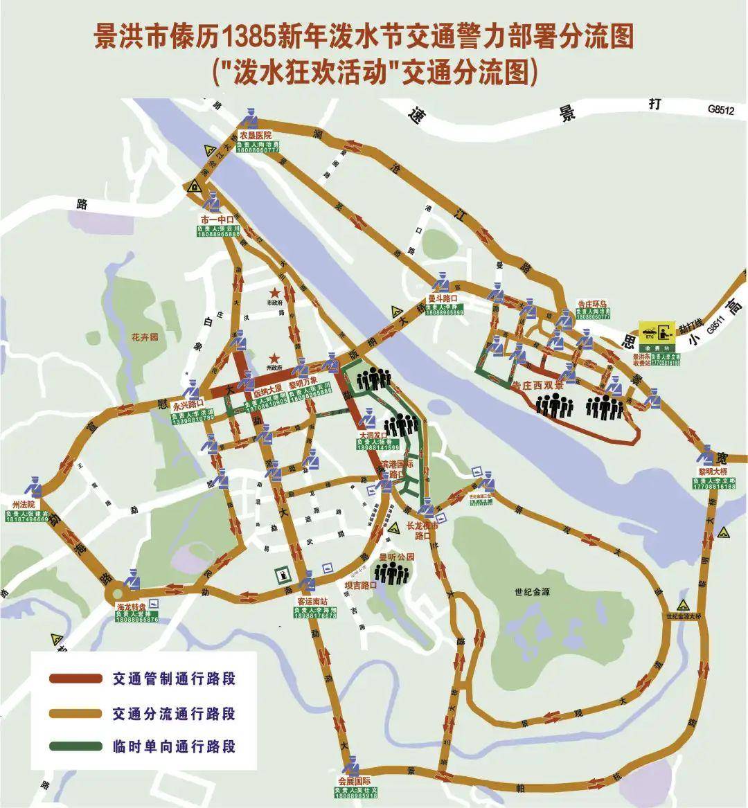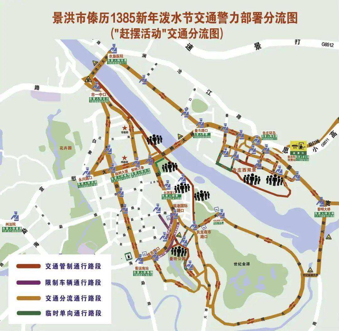 4月15日10:00至16:00泼水节活动期间,对景洪市勐泐大道九洲医院路口至景洪客运南站路口、宣慰大道景亮路口至中国农业银行景洪支行路口、勐海路西双版纳大桥路口至滨港国际路口实施临时性交通管制,限制车辆通行。