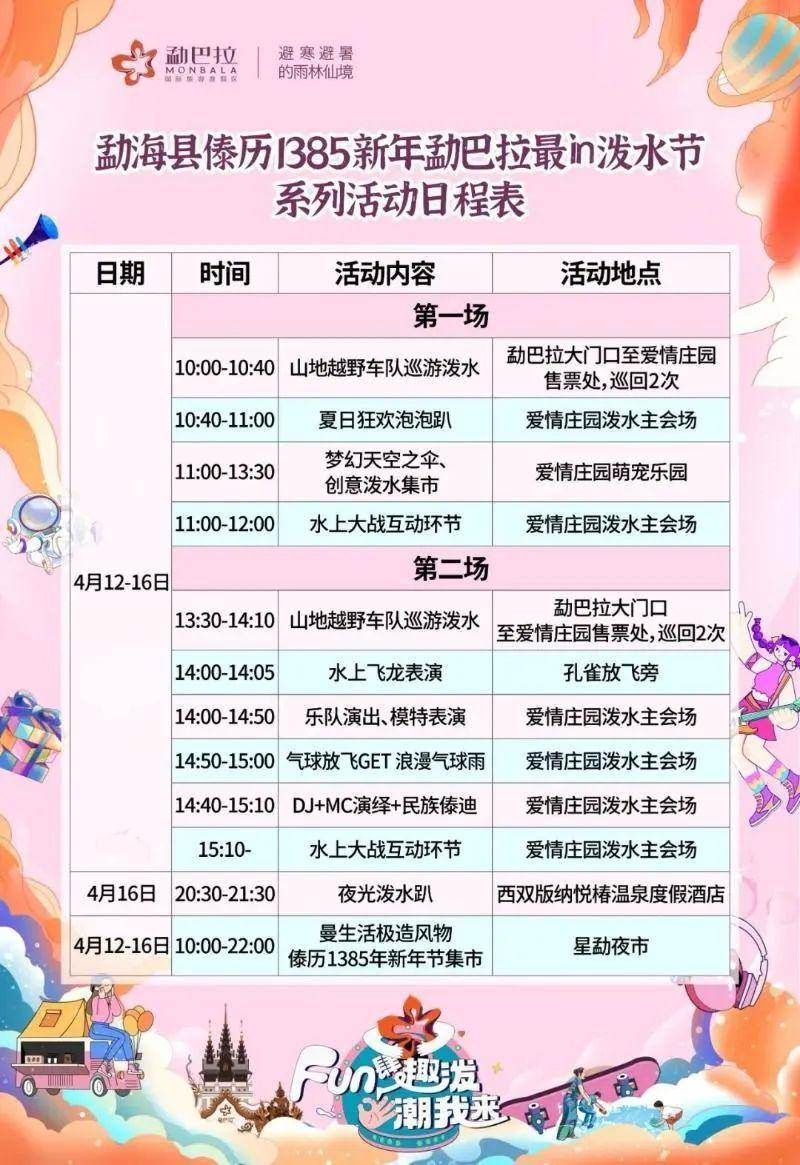 4月12日—16日,勐巴拉旅游度假区将推出电音泼水、夏日泡沫、傣族赶摆、草坪“躺营”、水上冲浪、创意集市、兔子公仔、气球放飞、宠物联萌、天空之伞等打卡项目,带你一起闯进“勐幻爱情庄园泼水节主会场”,嗨“爆”全场。