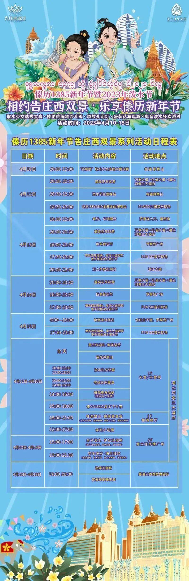 自4月10日起,告庄西双景会陆续推出精彩活动与游客朋友欢度傣历1385年新年节。你可以在帕雅真舞台见证取水少女们的精彩比拼;到万象大道、孔雀大道参与精美主题花车大巡游;通过精彩的民族表演、特色音乐节享受视听的极致体验;在燃放孔明灯和水花的祝福中,接受“泼湿全身,幸福终身”的美好祝愿。