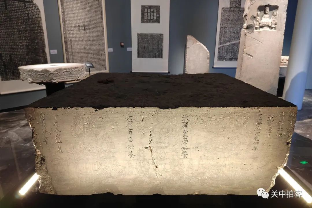 这里有一件大唐皇帝、皇后供养经幢基座,呈长方体,长110厘米,宽105厘米,高42厘米,经幢的其他部分已经不知所踪。在经幢的四个侧面,分别线刻帝后礼佛图、供养人和瑞兽图,单线勾勒,简约流畅。