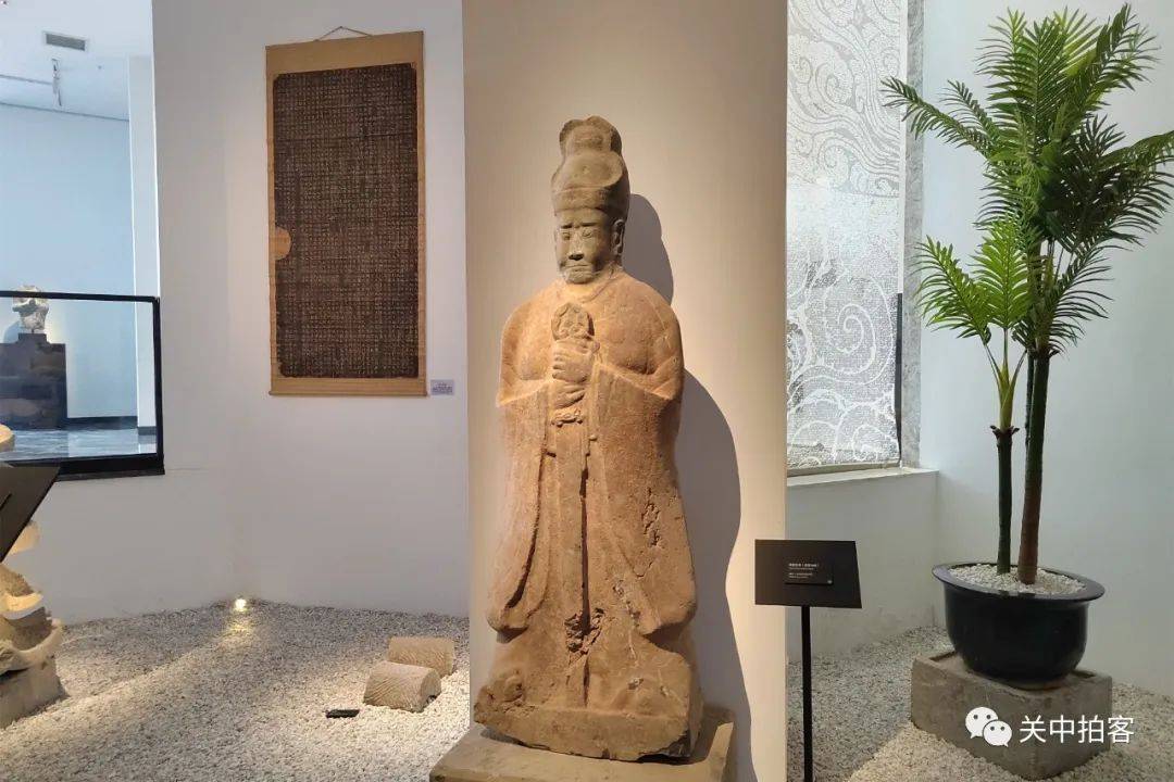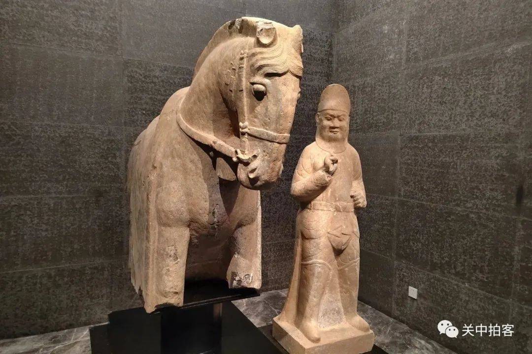 在古代的陵墓地面上,竖立着大量陵墓石刻,包括望柱、翁仲、狮子、马、羊、虎等各种纪念性和仪卫性的石雕作品。这里陈列着翁仲和胡人牵马等石雕,跟唐代帝王陵墓神道上的石刻非常相似,刻画精细,栩栩如生。