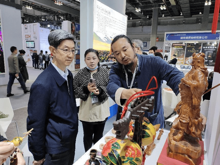省文化和旅游厅副厅长陈少卿在山西展厅与参展人员深入交流,希望大家利用好各种展览活动平台,宣传推广好富有山西特色的文化旅游产品。