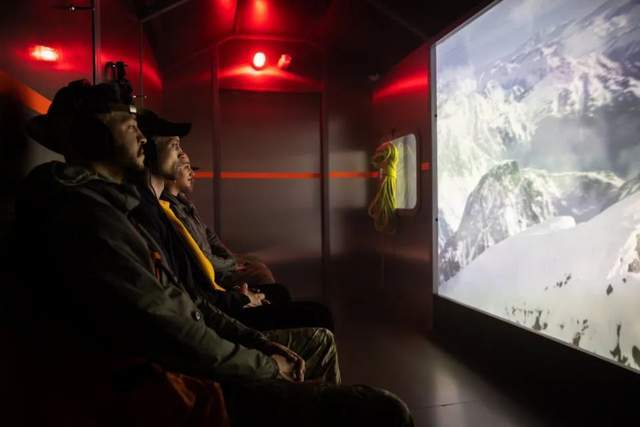 旅程从穿梭巴士开始,体验者戴上耳机,坐在一架抽象的直升机上,北岸救援队负责人迈克丹克斯通过无线电为他们攀登做准备,他们通过舷窗瞥见由多媒体景观带来的错落有致的雪山,进入山区体验之旅。