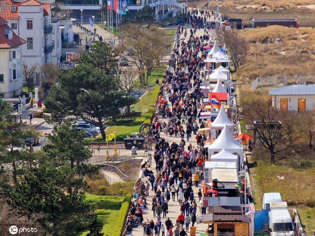 德国梅克伦堡-西波美拉尼亚州瓦尔讷明德,民众沿着长廊漫步。