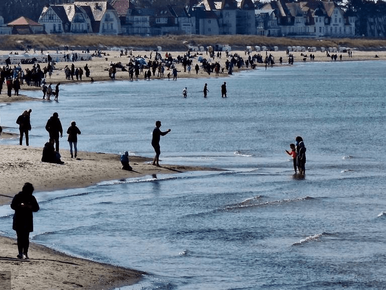 德国梅克伦堡-西波美拉尼亚州瓦尔讷明德,天气晴好,许多人利用最后一天的假期在海滩放松休闲。