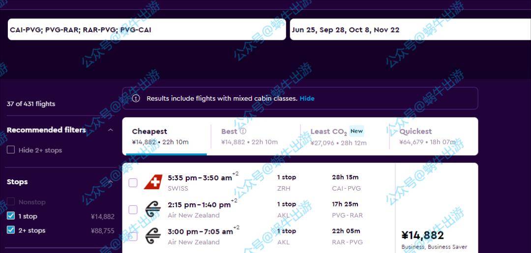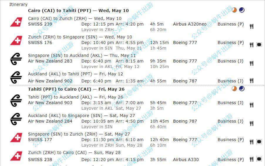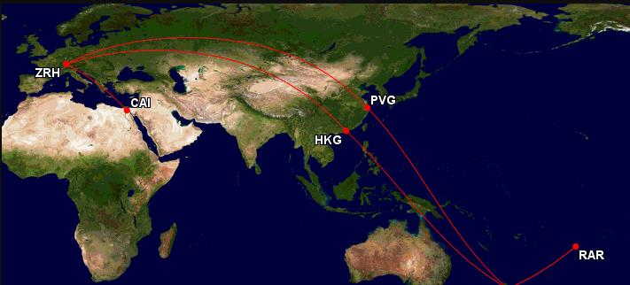 从开罗出发(非洲),经苏黎世中转(欧洲),上海/香港停留(亚洲),奥克兰中转(大洋洲),前往拉罗汤加(大洋洲)。这套商务舱机票行程涉及四大洲。