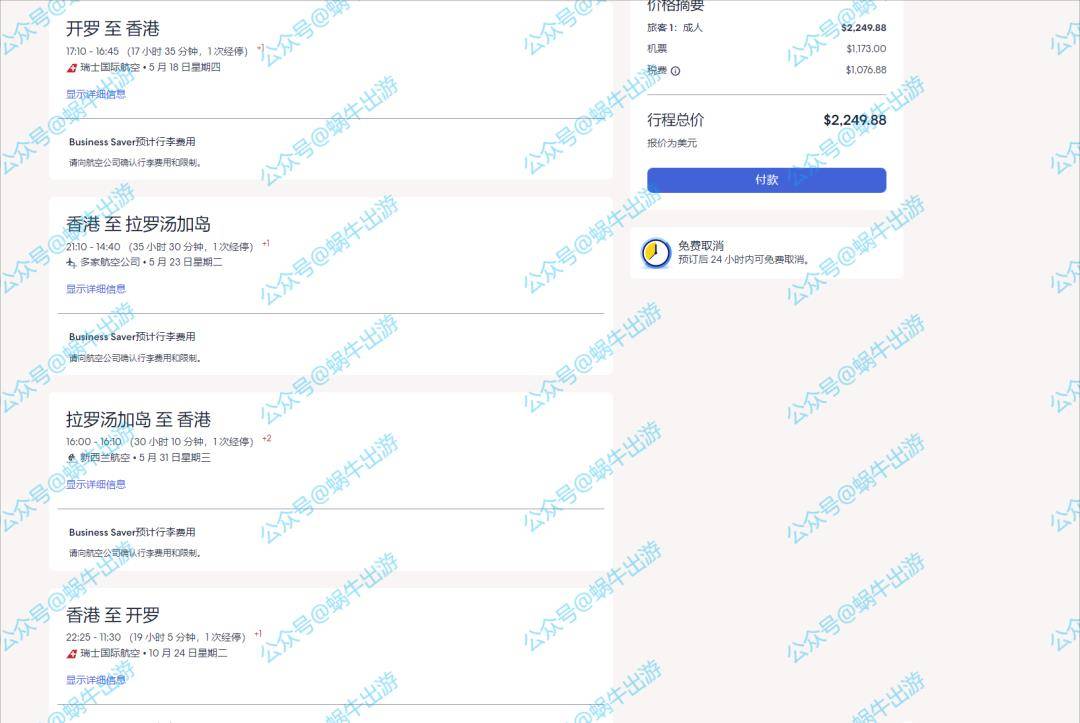 如上图的行程,往返都在香港设置停留的话,可以做到全程商务舱税后2250美元(约人民币1万5元)的价格。