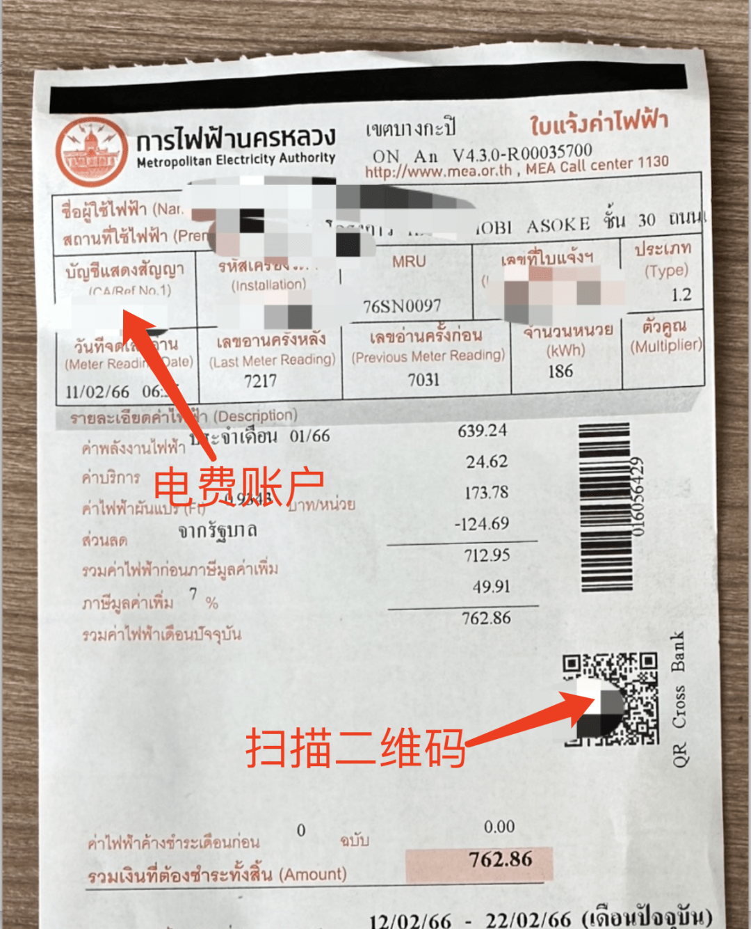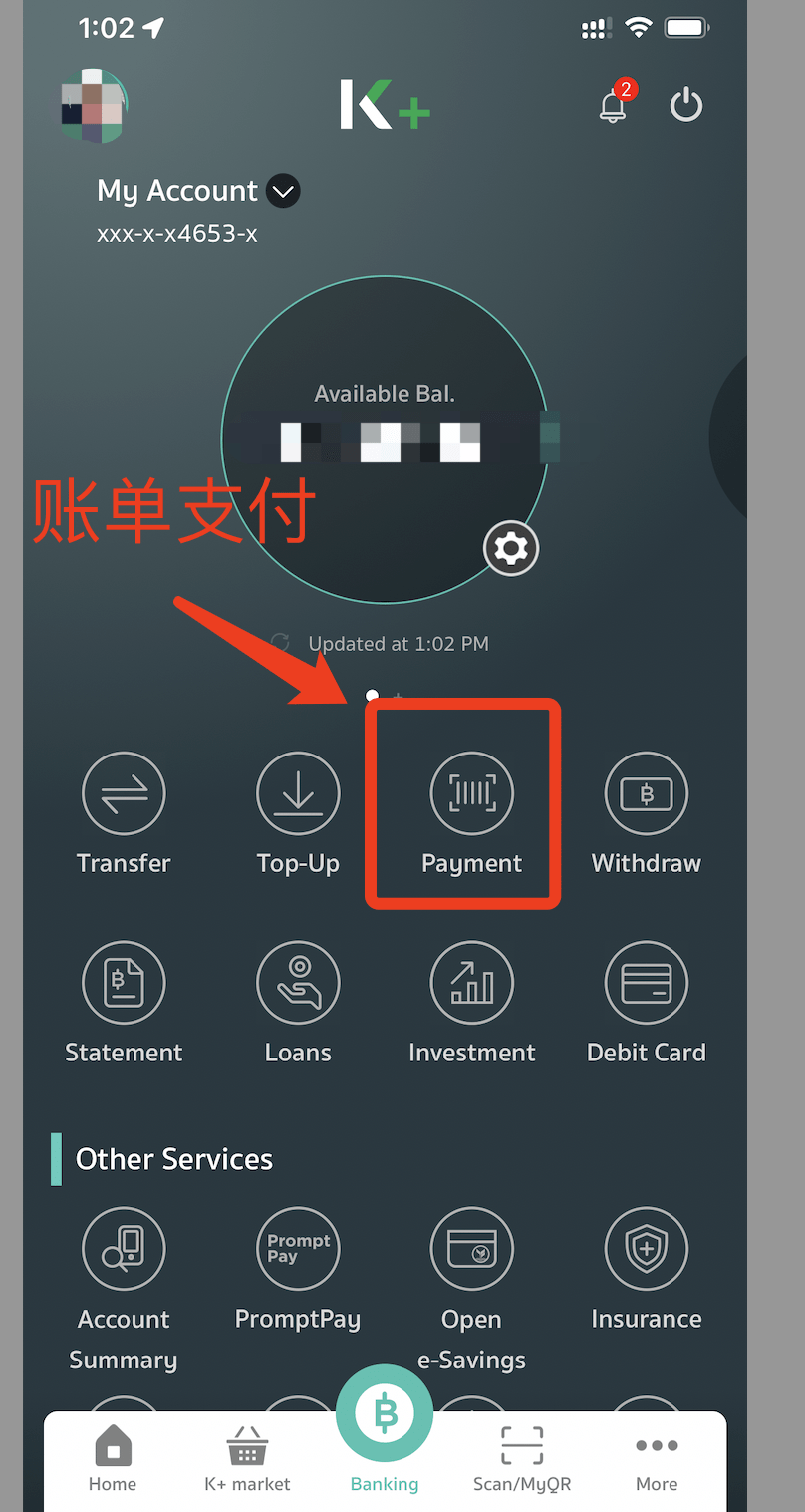 如果你开通了泰国银行的账户,可以下载一个该银行的APP;每个银行APP上都有“公用事业”缴费的功能。收到电费单后,最简单的方式就是用银行APP的扫码功能,扫描电费单上的二维码,然后按照步骤缴费就行。