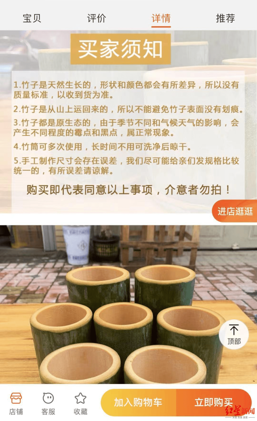 但是一些个体商铺或者摊位因为使用竹筒杯的数量相对较小,会在网上批发进货。如果竹筒发霉了怎么办?能否回收利用呢?网络购物平台上,有卖家在宣传中表示,“竹子是新鲜天然制作,放着不用的话,会由于季节气候不同,可能会引起不同程度的发霉,因此应将竹筒放在干燥通风处,若遇到发霉的情况,可以用淡热水冲洗晾干后正常使用。竹筒可多次使用,长时间不用可洗净后晾干。”