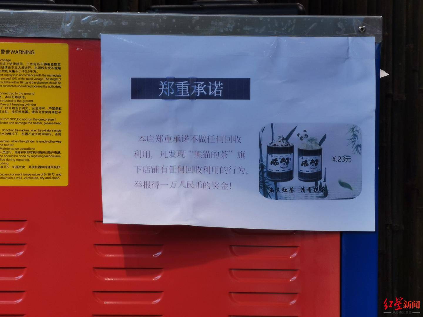 此外,记者在一家竹筒奶茶店看到,商家贴出告示称,“本店郑重承诺不做任何回收利用”,若市民发现店铺有回收利用的行为,举报可得一万元奖金。