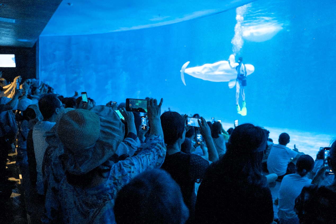 马来西亚游客正在观看白鲸表演