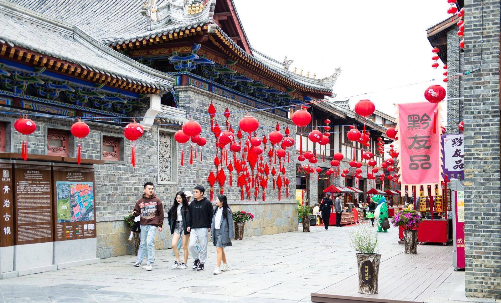 青岩古镇北城门外的青岩寻坊街区热闹非凡,在这条以夜经济、餐饮民宿、非物质文化遗产展示等为主要业态的特色文化旅游街区,游客既能品尝到各地的黔地美食、浏览观光街区风光,还能在国潮店铺、文创体验店感受新兴潮流与传统文化碰撞的魅力。