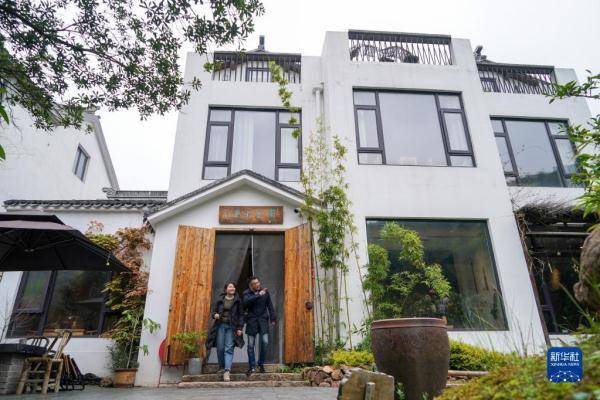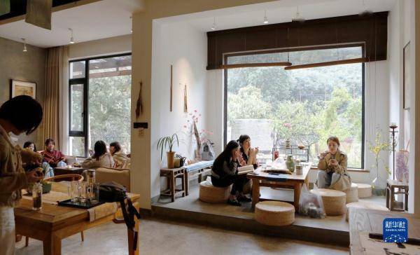 4月6日,游客在江苏省苏州市高新区通安镇树山村的民宿“兰兮小筑”内喝茶休息。 新华社记者 柳文惠 摄