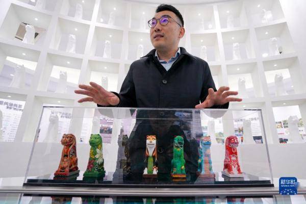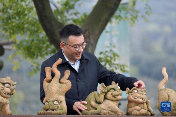 4月6日,彭锐在介绍文创产品“树山守”。 新华社记者 柳文惠 摄