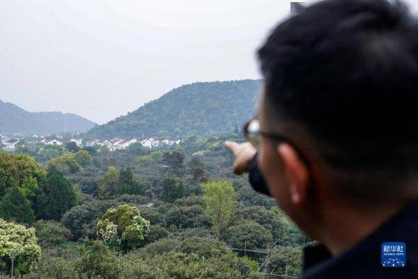 4月6日,彭锐在观景平台远眺树山村。 新华社记者 李博 摄