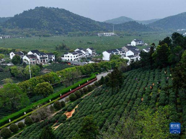 4月7日,采茶工在树山村的茶园里采茶(无人机照片)。 新华社记者 李博 摄