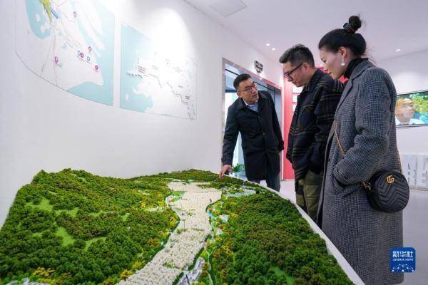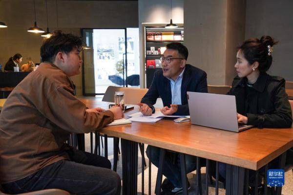 4月6日,在树山村乡村双创中心,彭锐(左)为前来咨询的客户介绍树山村基本情况。 新华社记者 李博 摄