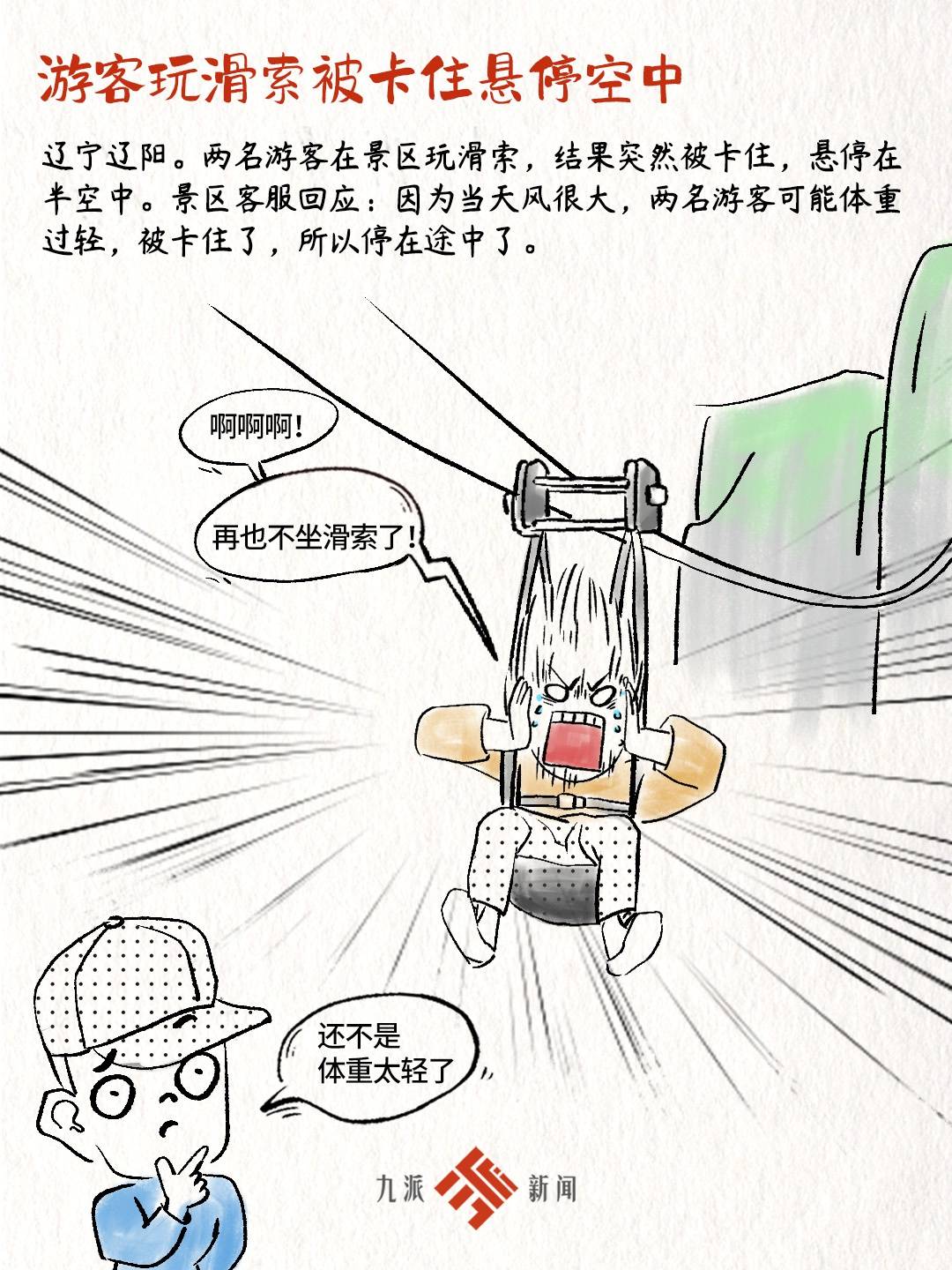 辽宁辽阳。两名游客在景区玩滑索,结果突然被卡住,悬停在半空中。景区客服回应:因为当天风很大,两名游客可能体重过轻,被卡住了,所以停在途中了。