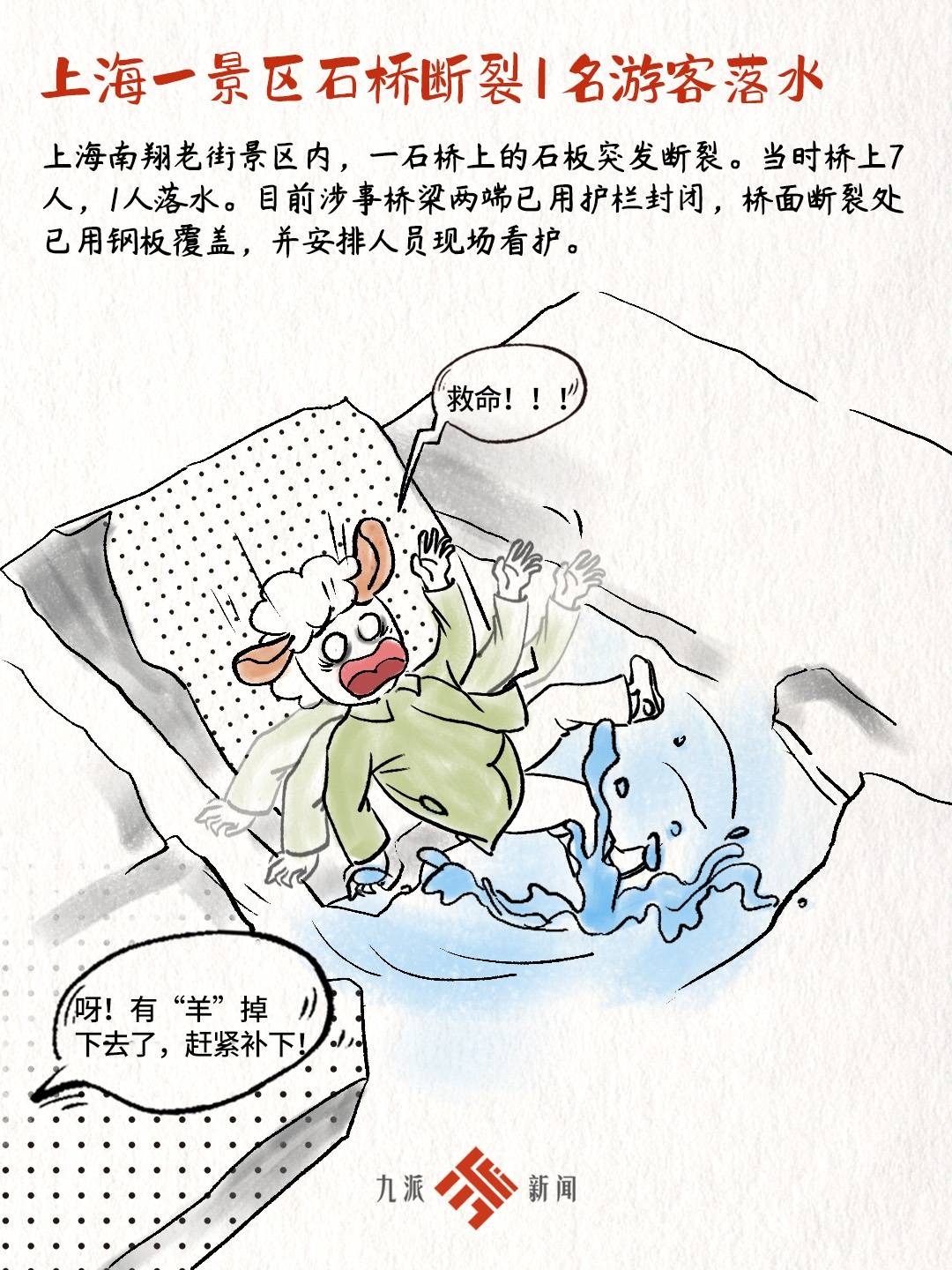 上海南翔老街景区内,一石桥上的石板突发断裂。当时桥上7人,1人落水。目前涉事桥梁两端已用护栏封闭,桥面断裂处已用钢板覆盖,并安排人员现场看护。