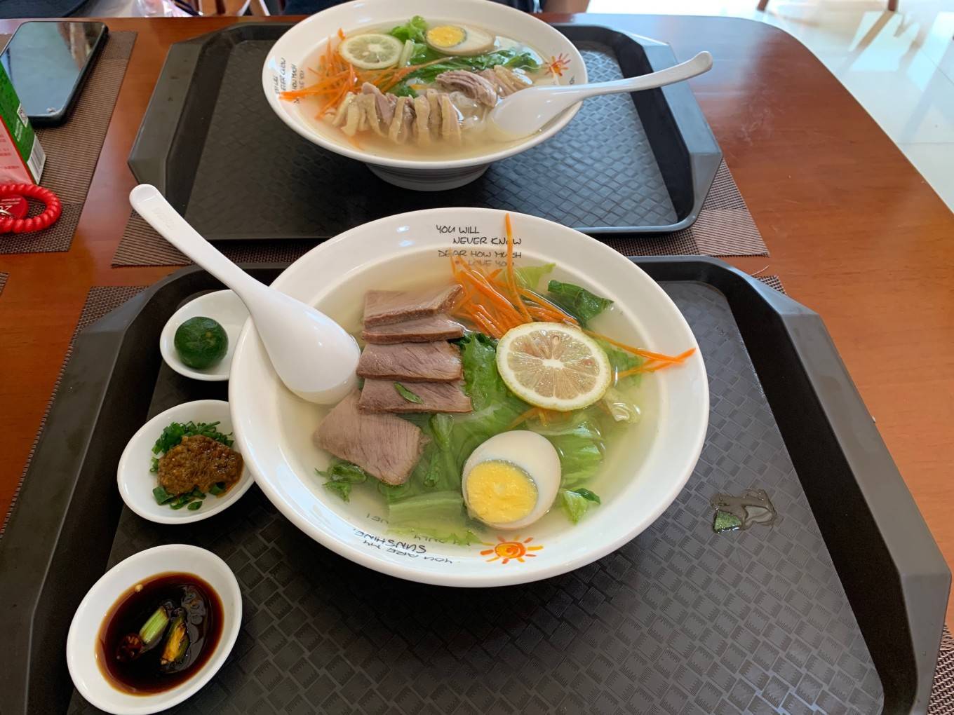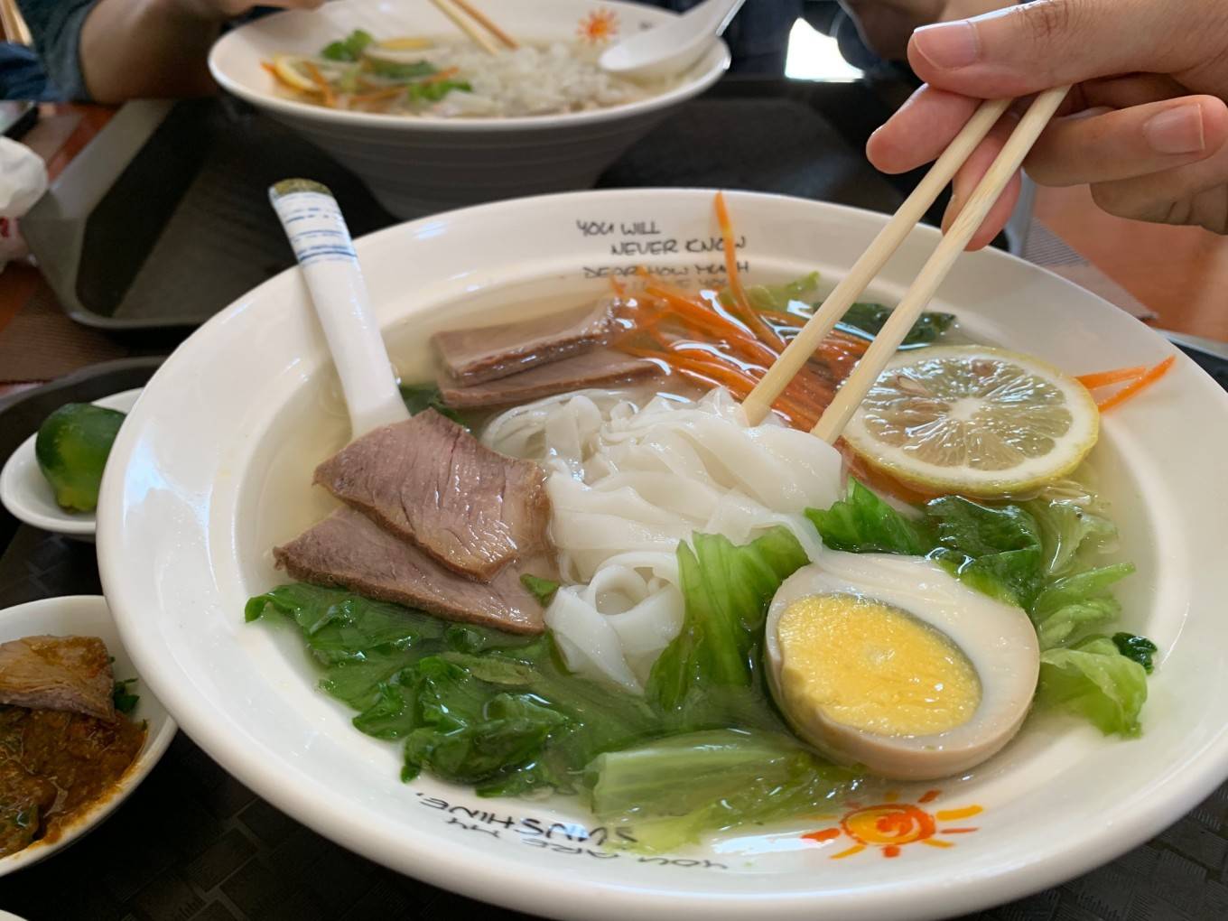 叫了一个鸡丝粉,一个牛肉粉,还有炸香蕉。粉的汤底应该是这几天吃过的粉里面最清淡的了,说是牛大力汤底。加了一点小青柑和自制的辣酱,野味一点,也比较清新哈哈