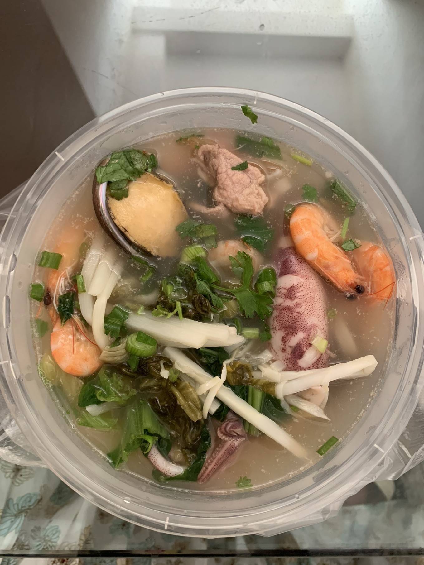 早上叫了鲜粉世家的海鲜粉,有鲍鱼、鱿鱼、虾,海鲜还是挺多的