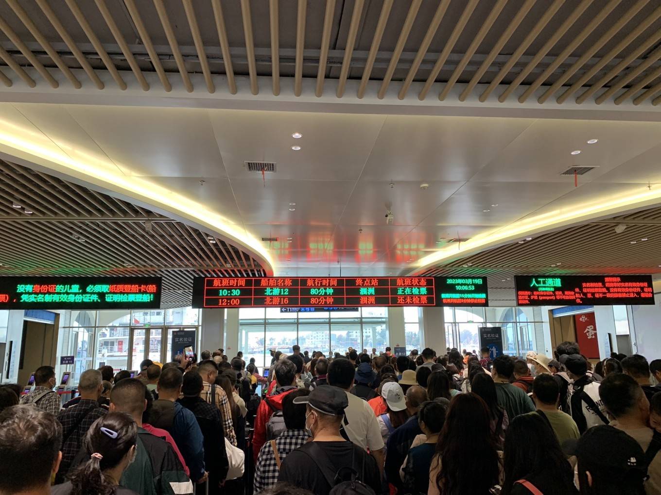 建议提早30分钟到客运港,我们上岛是周末,排队上船的人真的很多,检票口排满人。客运港有寄存行李的地方,也有卫生间,验票无需取纸质票,刷身份证即可。