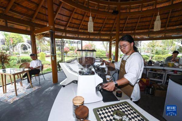 4月11日,工作人员在伍浦村渔耕文化园的陶湾里乡村咖啡店工作。