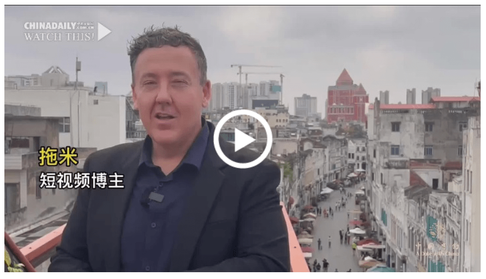 4月10日,“2023年中国有约国际媒体主题采访活动”走进海南海口骑楼建筑历史文化街区(骑楼老街),美国视频博主拖米在线安利骑楼老街。