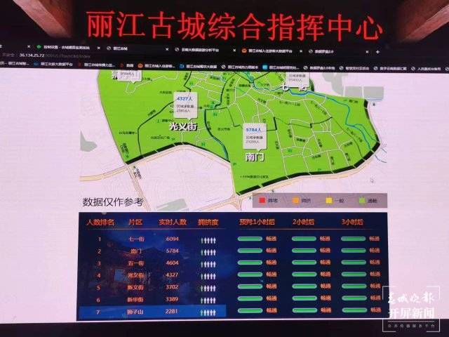 “到旅游旺季,我们的人流量是非常大的。通过人流量监测系统,我们可以看到每个区域的实际人数和区域承载量,有利于我们根据游客的游览路线提前作出预判。当人流量达到最高峰值时,相关部门可以进行有效的人员疏导,确保游客在丽江古城游览中的安全得到保障。”在丽江古城综合管理指挥中心,丽江古城综合指挥办公室主任张业兵通过大屏,向记者展示了智慧小镇的人流疏导系统。大屏上显示着各个区域当前的人数,并对1~3小时后区域的拥挤程度作出预判。