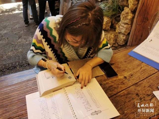 从福建来丽江旅游的黄女士在东巴纸坊买了东巴纸装订的笔记本后,立刻依照纸坊里的东巴文指南,在笔记本上用东巴文写下“心向往之”四个字,“我刚刚还百度了一下,它表示对事物或者哪里比较向往,就像我向往丽江,之后我在丽江旅游看到的风景我也都画在这个本子里。”黄女士开心地分享着自己对丽江的喜爱之情。