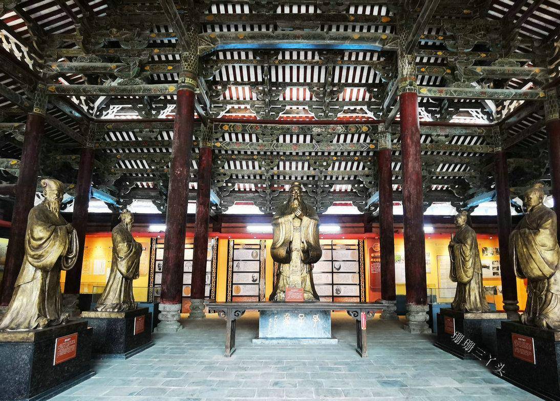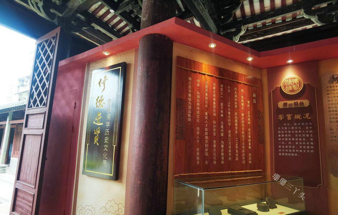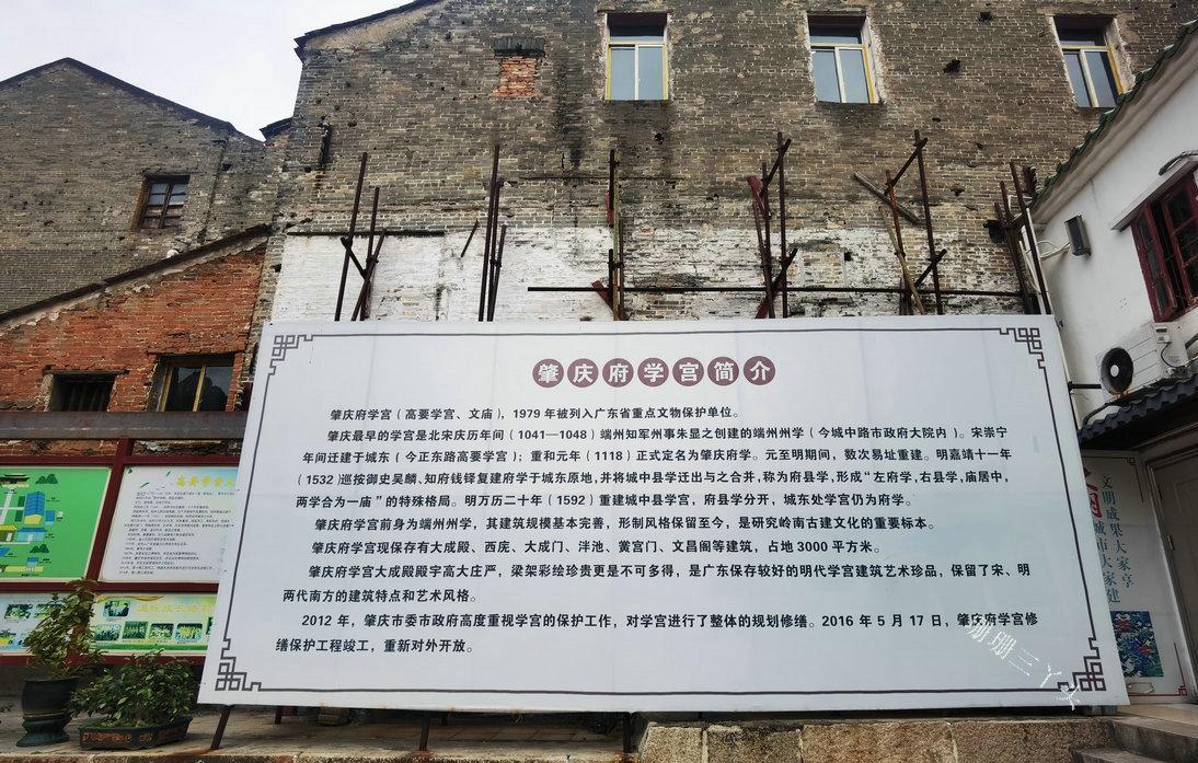 在泮池的一边,珊珊三丫头看到了高要学宫的介绍:高要学宫始建于北宋崇宁初,当时郡守毛衍开始,再经历张新、林景新两郡守,最终建成。学宫在元朝时被毁,元末又加以修葺,后毁于兵战。到了明洪武二年知府李从培主持的重建。明天顺年间,学宫又两被匪贼所据,毁坏严重,后来迁到了城中,到嘉靖十年才迁回原址,并进行了扩建。在隆庆到万历三十年间进行重修、扩展,逐步形成了现存规模的学宫殿宇。1940至1943年,肇庆遭遇了日机轰炸,学宫遭到了重创,仅仅保存了大成殿、两庑和大成门、泮池桥等少数建筑。在1959年,大成殿台基下沉,四翼倾斜,省政府拨款抢修大成殿。1986年,再次重修大成殿。1987年,高要成立博物馆,学宫就成为高要博物馆旧馆址。2009年,学宫并交由肇庆市博物馆管理使用。2010年底,学宫修缮保护工程启动,2016年完工,现在的高要学宫保留了宋、明两代南方的建筑特点和艺术风格,十分珍贵。