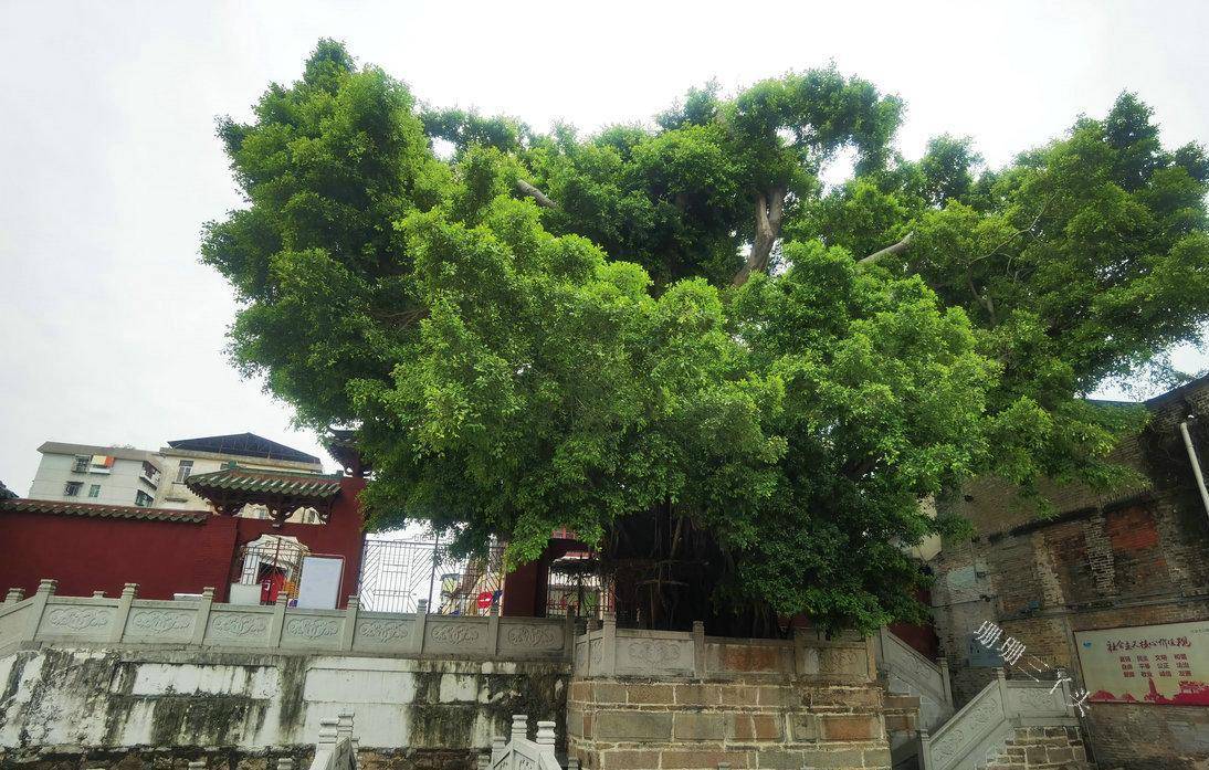 在高位处,可以完整地看到这里有一个半月形水池,水池上方有一座石桥。在古代科举考试时,学子们把过桥拜孔子,称为入泮。在泮池旁边,有一株硕大的榕树,树干挺拔、因为春天刚发芽,树叶苍翠,十分好看,从榕树庞大的身躯,能感觉这棵大榕树经历了许多岁月,一直守护着这里。