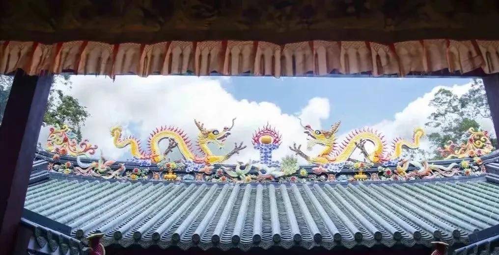 透过寺内的露天天井望去,外面屋顶的上的双龙戏珠,在青瓦绿树和蓝天白云的映衬下,显得非常壮观,像是一副活灵活现的画卷。