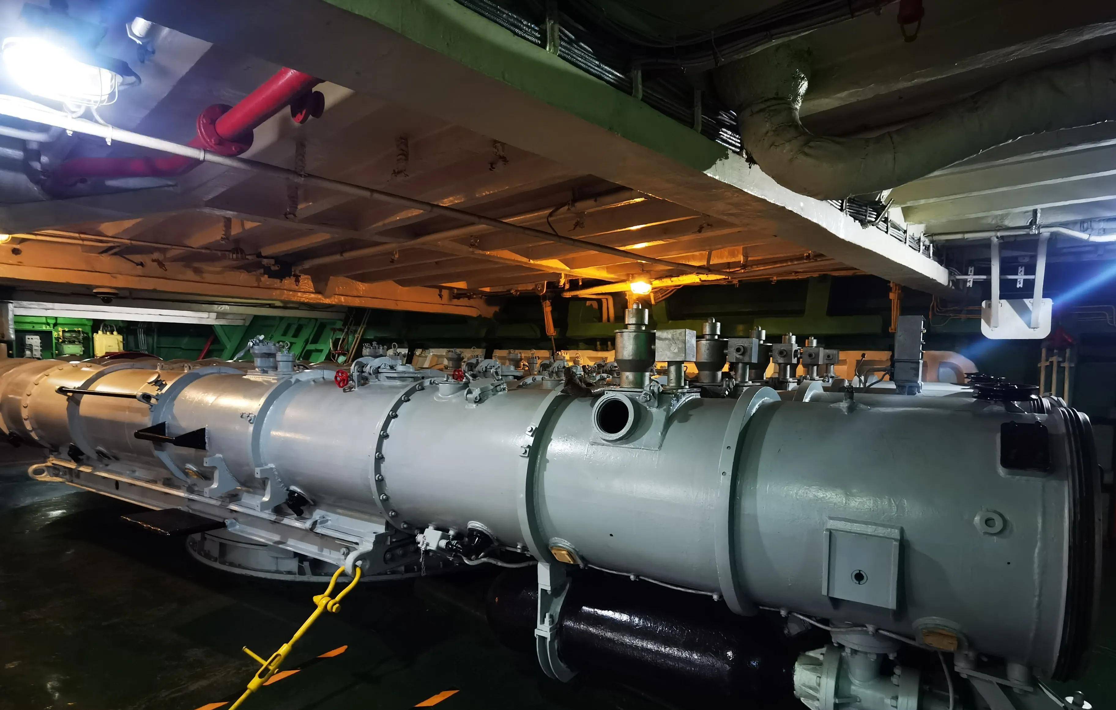 76毫米火炮库很像酒窖。但是这些架子上摆放的可不是什么伏特加,而是舰上的另一种武器76火炮的炮弹,这里可以储存炮弹近2000发,这种炮弹每发重6公斤,要由9名士兵配合共同完成炮弹的填装。当年,这里可是航母新兵的聚集地。