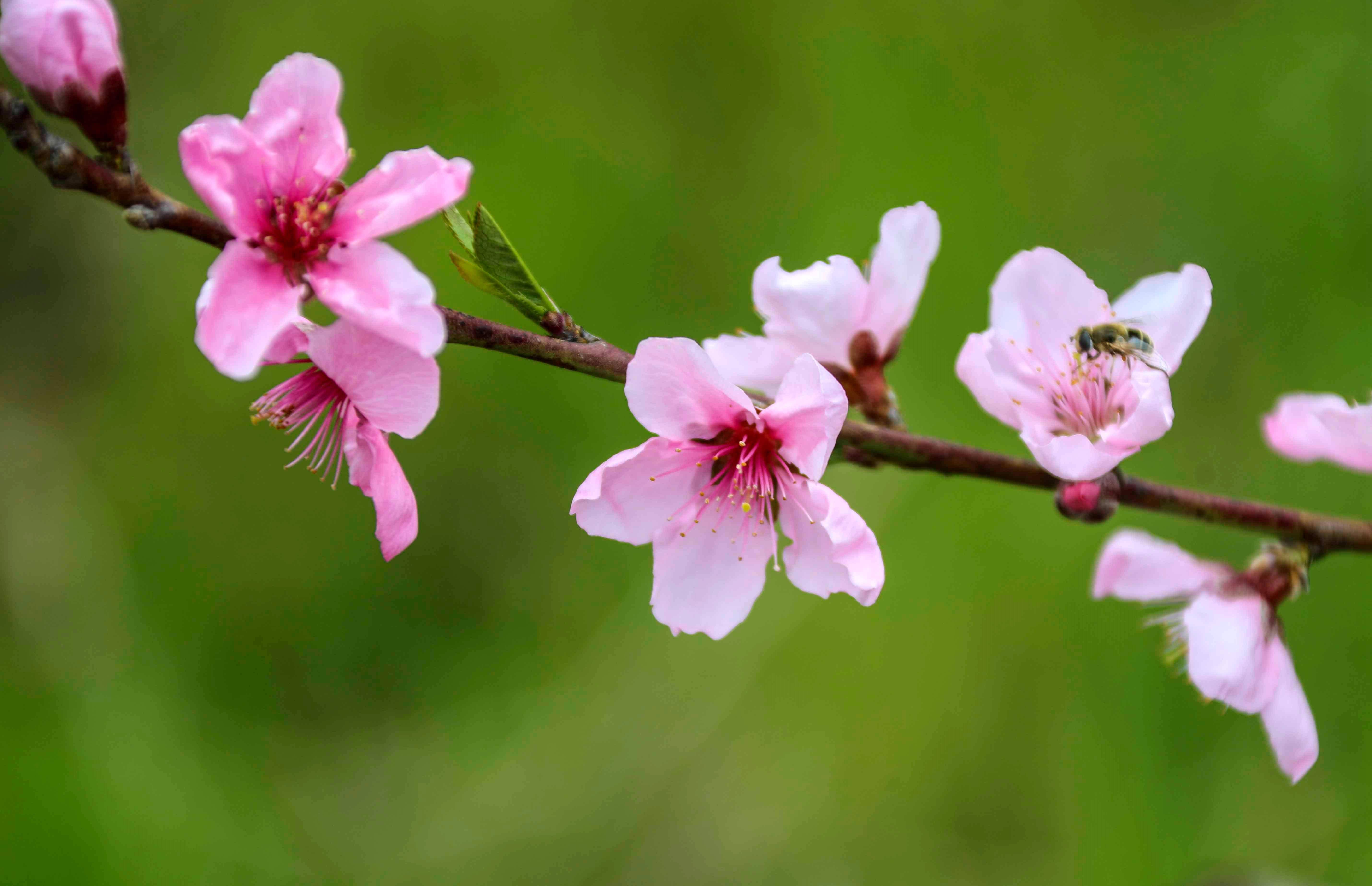 眼下正是踏春赏花的好时节,徐村新村桃花开得娇艳。我眼前的美景迫人,蜂蝶也赶来唱和。