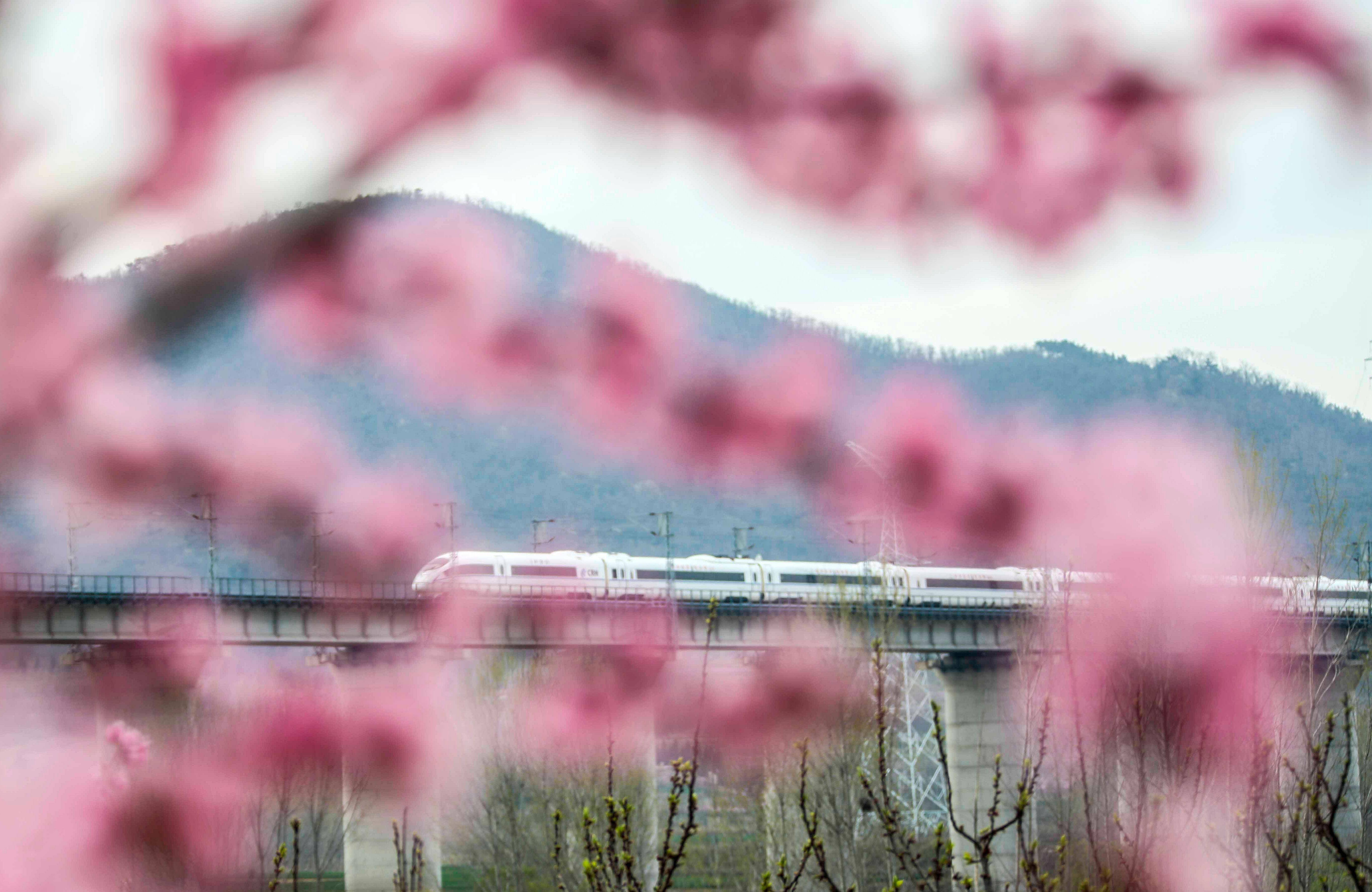 无人机在我的精心操纵下呼啸升空。只见机翼下桃花灼灼,动车穿越花海,农民花中耕耘,如画风景迷醉了春光。连绵的万亩桃源令我目不暇给,心花怒放。