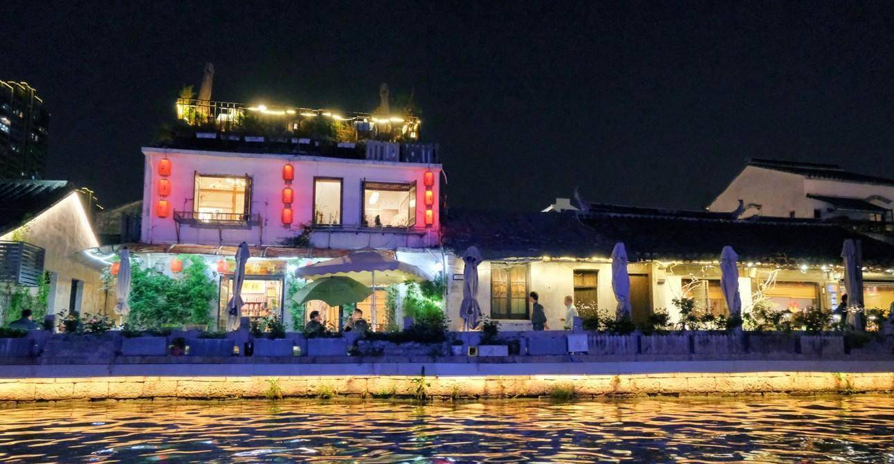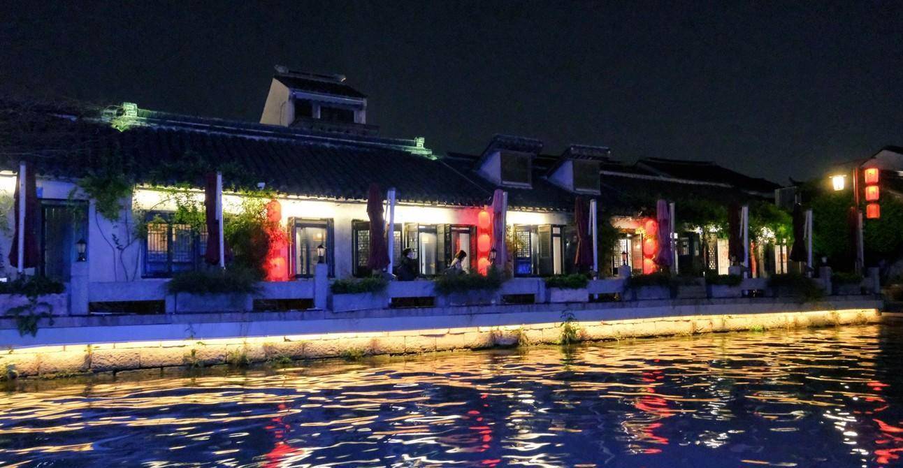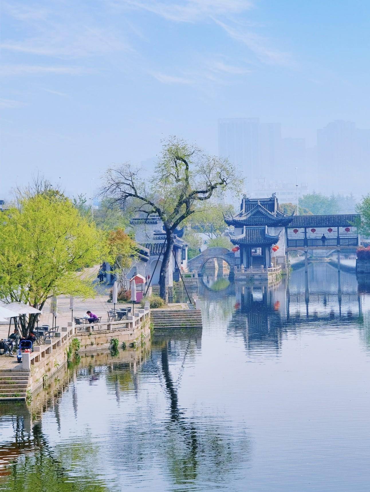 下了清名桥河边还有一条窄窄的临河小道,这里人比较少,对面的古楼在运河中晃晃悠悠,宛如一副泼墨水乡画。