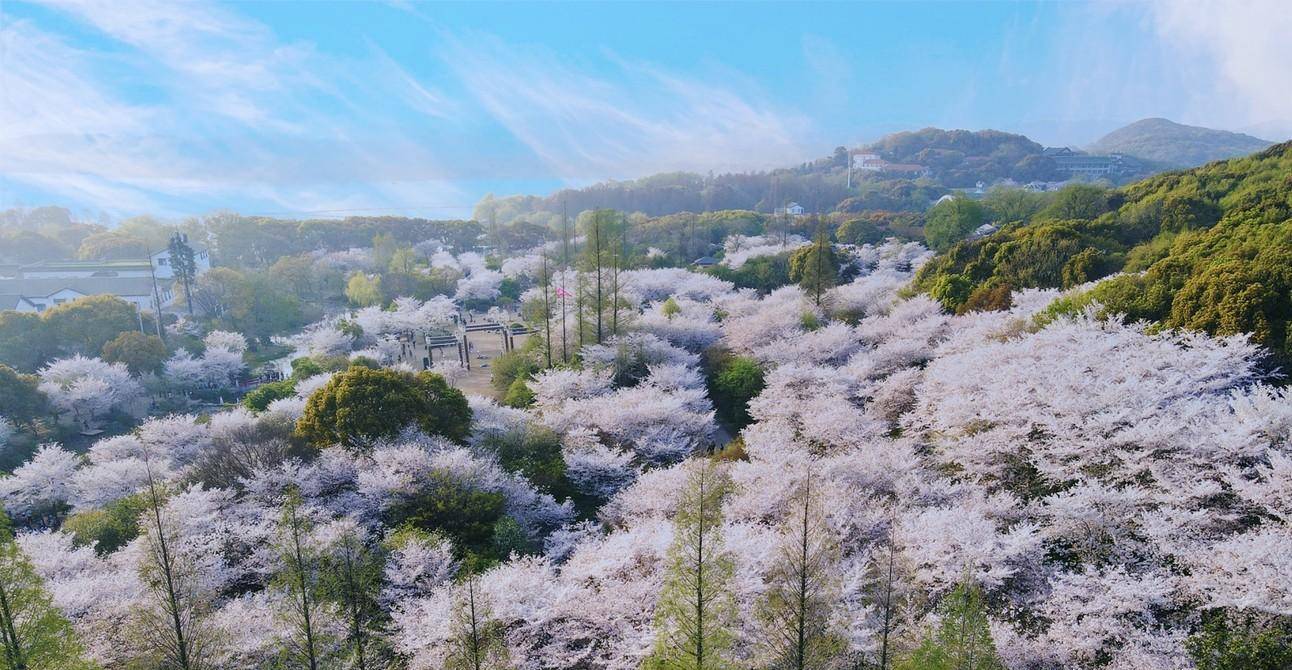 樱花谷内有3万多株、100个品种樱花树,现在正是樱花盛开时节,朵朵樱花如云似霞、满树烂漫,春风轻拂、落樱飞舞。