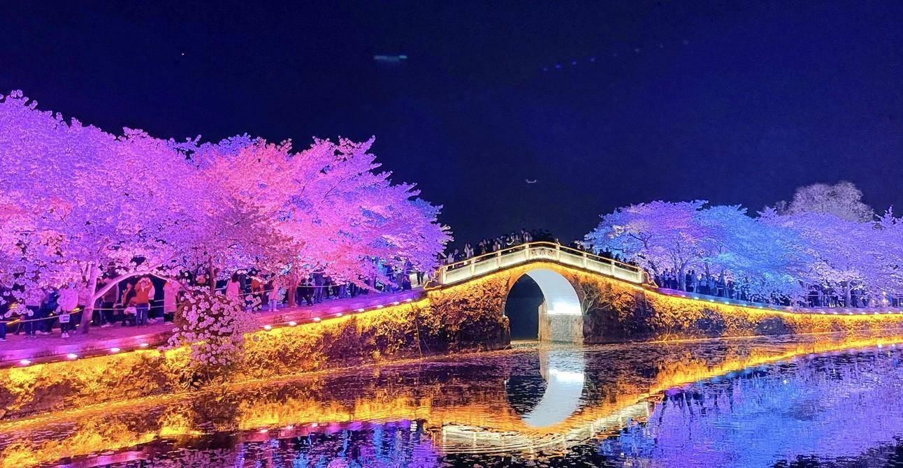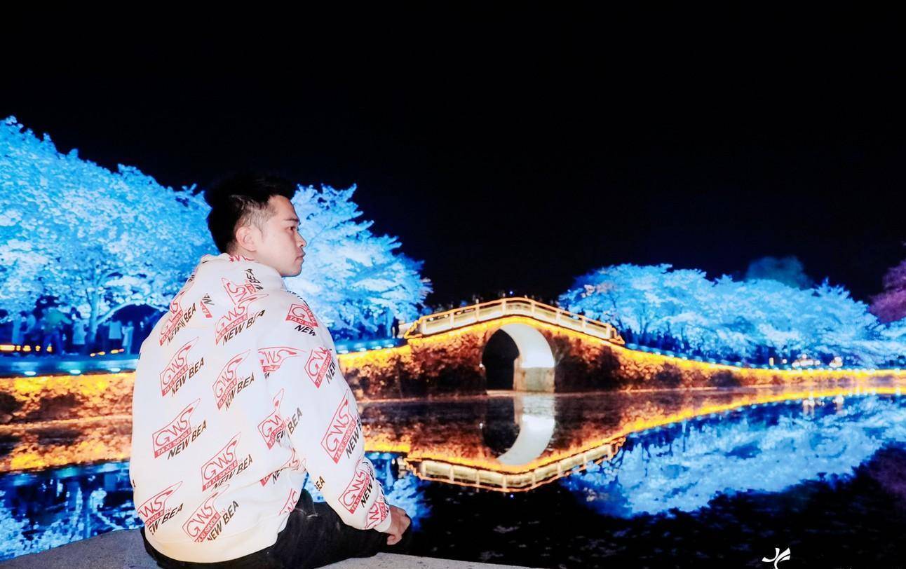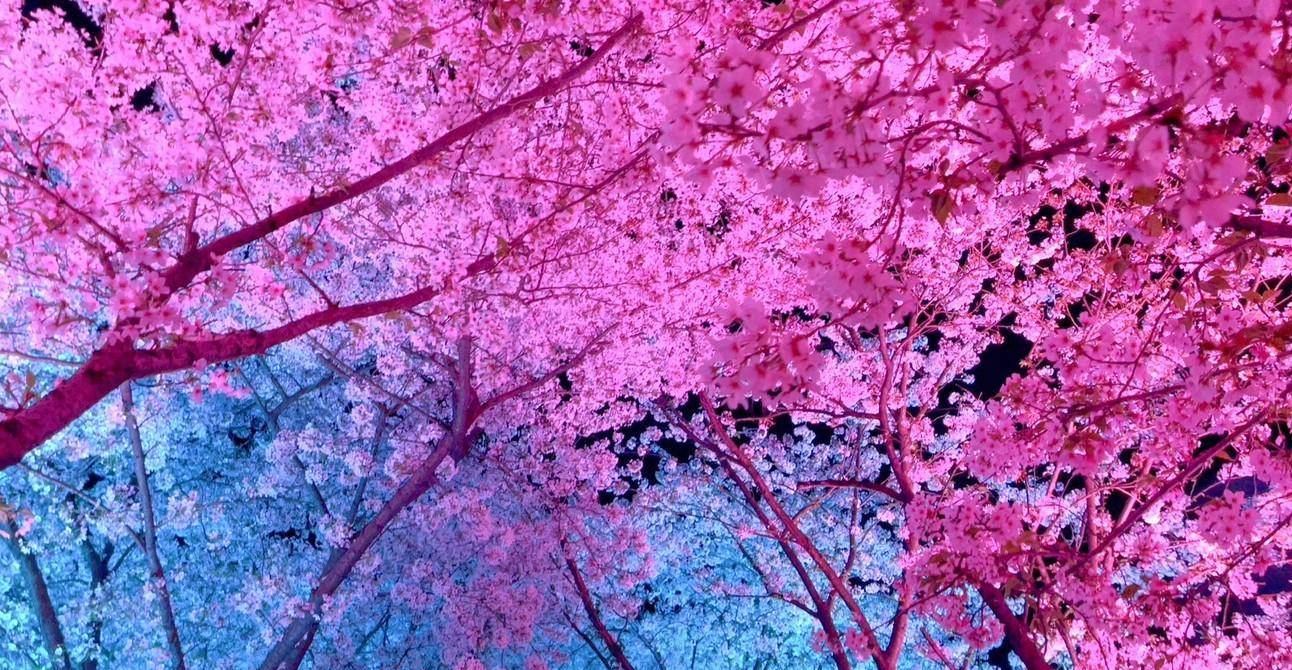 夜晚的樱花显得更加的魔幻,五颜六色,将这里营造出了一个非常浪漫的氛围。