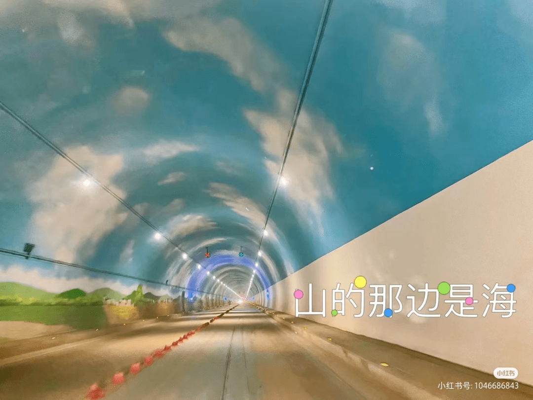 还未到达沙滩,在经过隧道的时候就已经被美住了!一整条隧道喷涂上蓝天白云的图案,就是这样的小确幸,共同组成了渔寮沙滩的美好。